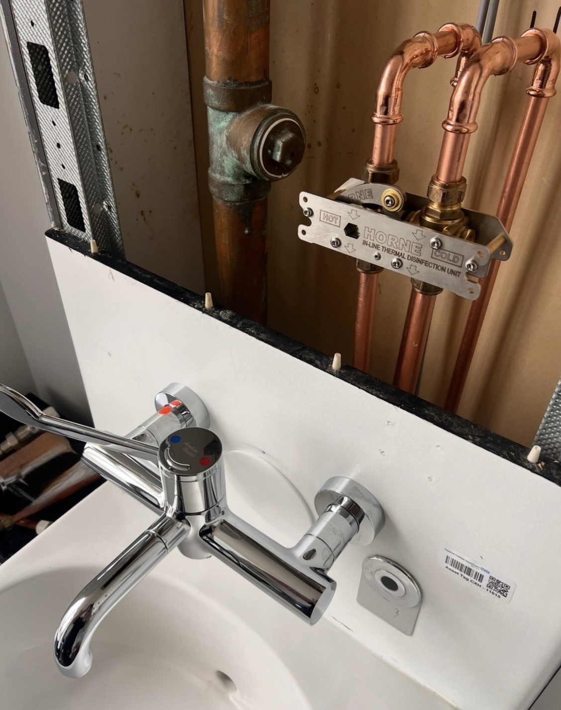 The works were carefully pre-programmed around individual wards and clinical areas, with a full programme agreed in advance by all relevant parties. Work areas were appropriately contained to prevent dust and debris from contaminating live hospital environments. Temporary mobile wash hand basins (WHBs) were installed to ensure there was no disruption to water services. Additionally, an in-line thermal disinfection unit was installed at each location, and new isolation valves were fitted as part of the upgrade.